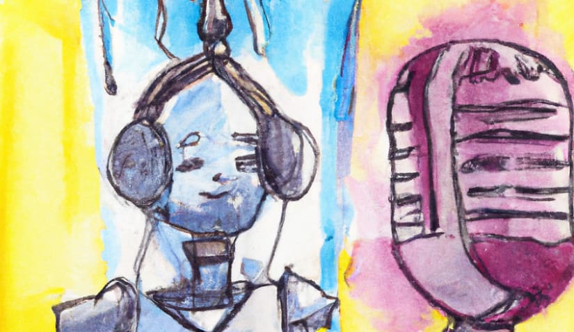 Generated by DALL·E 2 with the prompt: "Abstract pencil and watercolour of a robot being interviewed for a podcast, cyberpunk