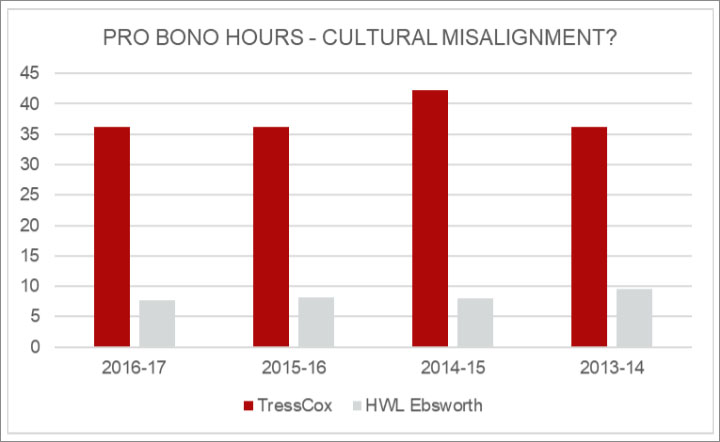In contrast, consider how well aligned were Norton Rose and Henry Davis York. Prior to merging, both firms shared a similarly strong commitment to pro bono work. As an integrated practice, that commitment has held steady.