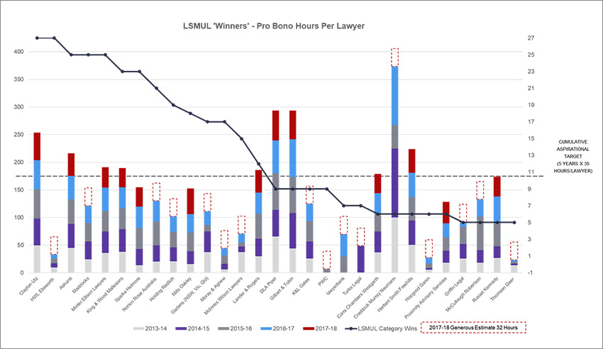 AUTHOR'S NOTE: "In my previous article I stated that 46 (75 per cent) of the new LSMUL firms were yet to achieve the pro bono Aspirational Target. That was incorrect. 46 firms did not achieve the Target in 2017-18. Three firms - McCullough Robertson, K&L Gates and Norton Rose Fulbright – have, in fact, achieved the Target in previous years."
